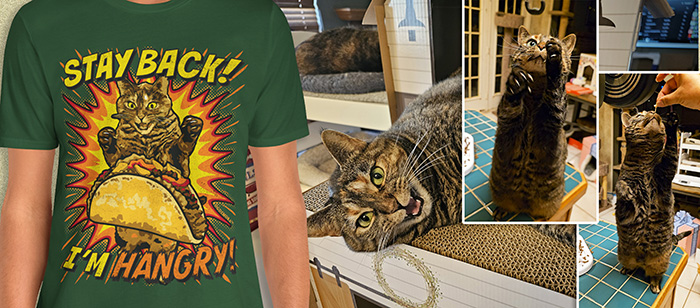 Hey cat lovers, I have a new shirt in my store! Hungry? Maybe even HANGRY? How about a taco? This one is near and dear to my heart, because I'm like this most days. π€£ The star of the shirt is Prudence, using bits from 3 different photos to create the crazy pose you see. If you like, you can find it in the Merch Store!